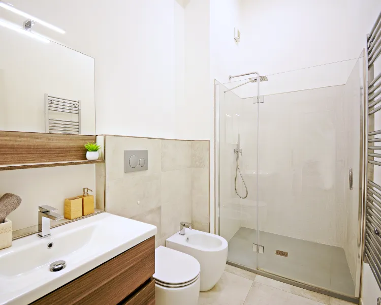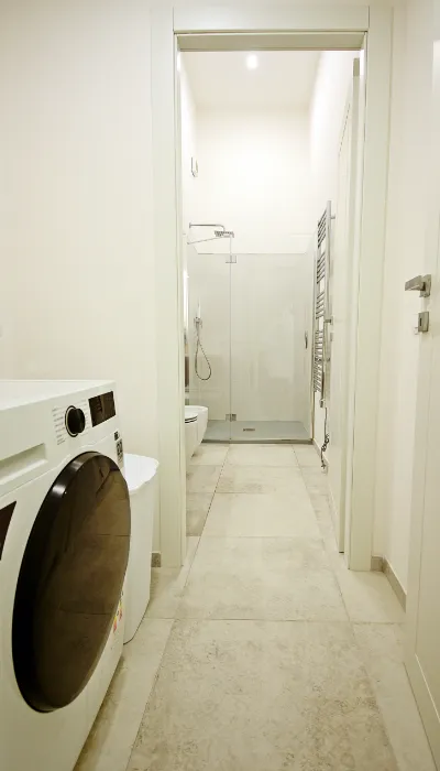 - lavandino, wc, bidet, doccia con soffione, cabina in cristallo, termoarraedo, lavatrice/asciugatrice.