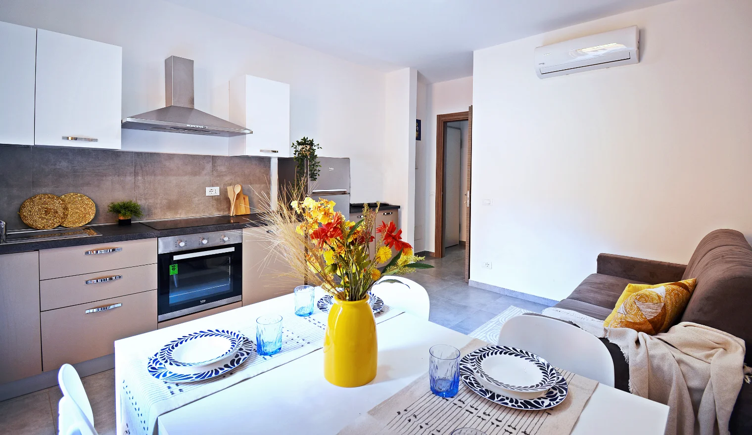 • Piastre ad induzione, forno elettrico, frigorifero, piatti piani, piatti fondi, posate, bicchieri, tazze da colazione, tazzine, tovagliette, pentole e tegame, presina, mestolo e pinze, sottopentola, tagliere, moka.