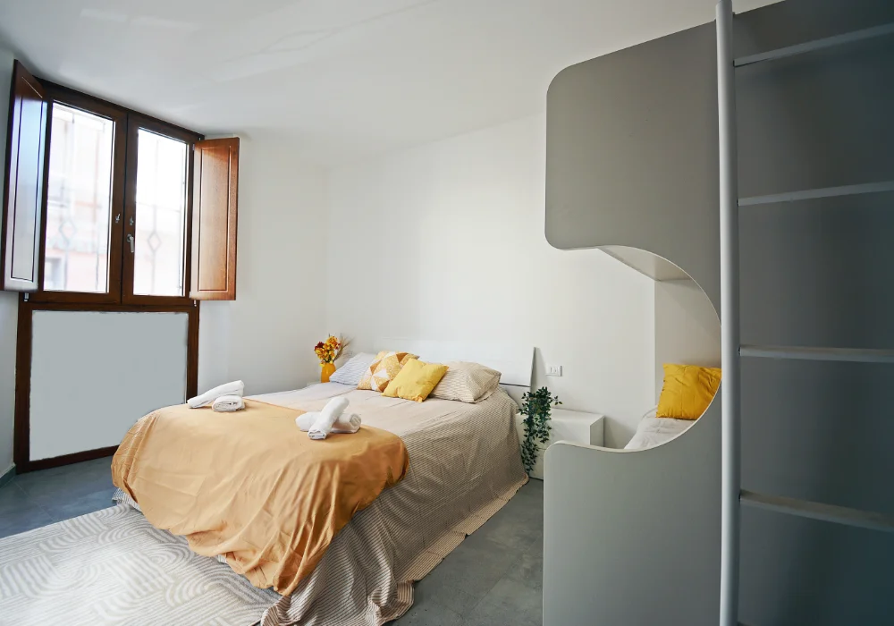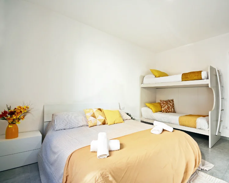 • Letto matrimoniale, materasso in lattice, cuscini, comodini, armadio con cassettiera, letto a castello.