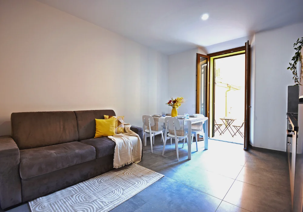 bilocale composto da ampio soggiorno con cucina a vista, accesso a corte esclusiva, disimpegno, camera matrimoniale e bagno.