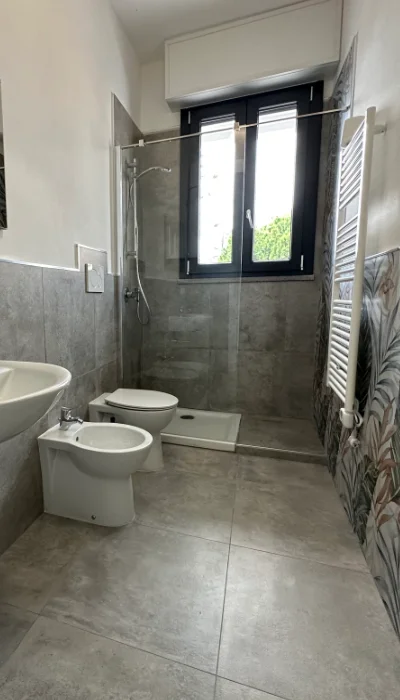 • Lavandino bidet wc e doccia con anta di cristallo.